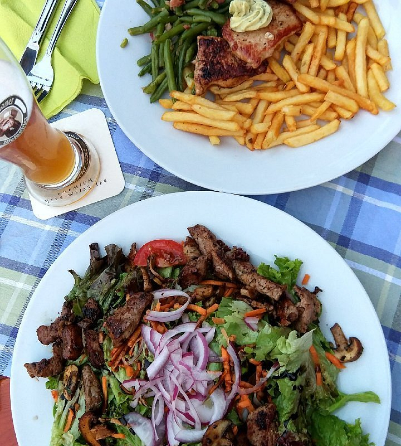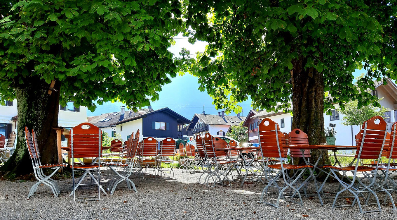 Im Sommer verbringen Sie angenehme Stunden im Biergarten unter den alten Kastanienbäumen mit Blick auf den Dorfbrunnen und die Hausberge. Frisch gezapfte Fassbiere wie Spaten Hell, Franziskaner Weißbier oder Kellerbier runden das Angebot ab.